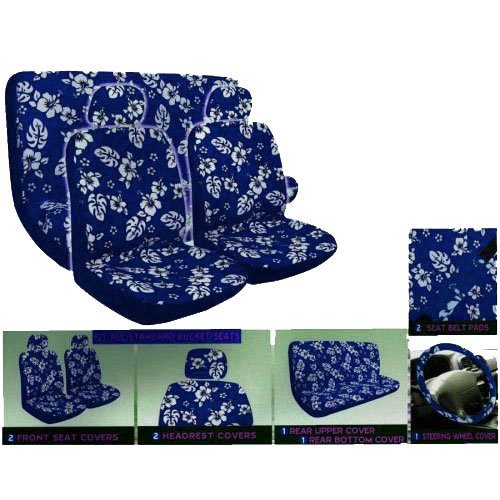 A Set of 8 Piece Hawaiian Floral Print Seat Cover Set - 2 Hibiscus Blue Low Back Front Bucket Seat Cover, 2 Hibiscus Blue Separate Headrest Cover, 1 Hibiscus Blue Bench, 1 Hibiscus Blue Steering Wheel Cover, and 2 Hibiscus Blue Shoulder Pad Review