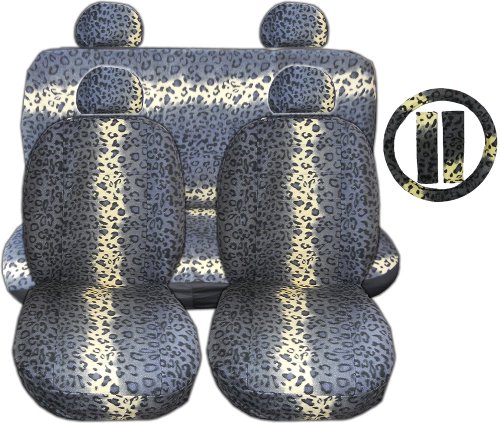 11pc Safari Gray Grey Snow Leopard Low Back Seat Covers with Head Rest Covers, Bench Cover with Head Rest Covers and Steering Wheel Cover with Shoulder Pads Review