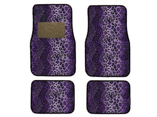 A set of 4 universal fit animal Print carpet floor mats for cars / truck, A Set of 2 Universal-Fit Front Animal Print Front Bucket Seat Covers, and One Animal Print Elastic Weave Scrunchie Steering Wheel Cover - Leopard Purple Review