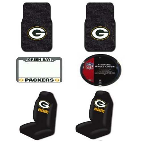 NFL Green Bay Packers 6 PC Auto Accessories Combo Kit - Rubber Floor Mats, Seat Covers, Steering Wheel Cover and Chrome License Plate Frame Review